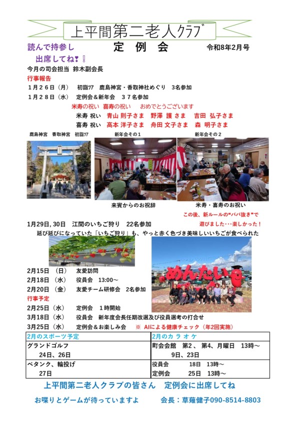 2026年2月21日 / 上平間第二老人クラブ, お知らせ一覧, イベント予定, 総務部, ホームページ班, 高齢社会部