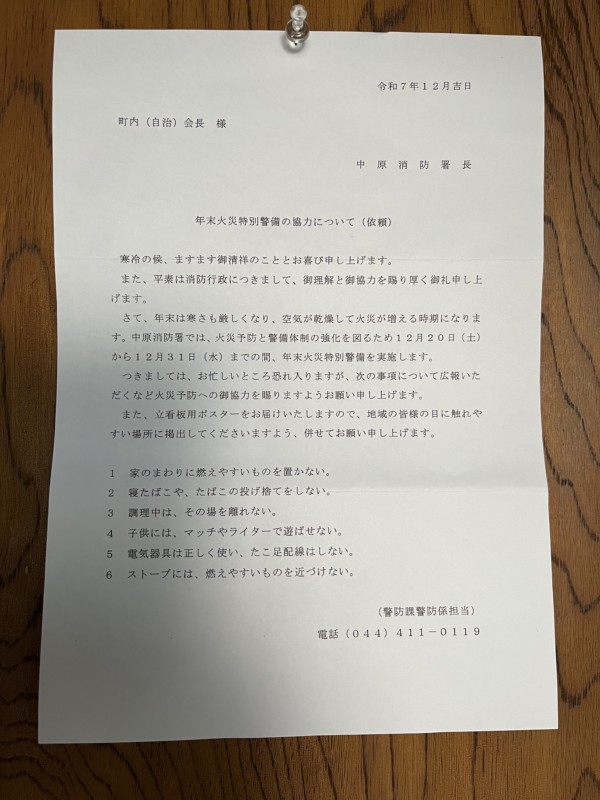 中原消防署より「年末火災特別警戒」について協力の依頼がありました。
