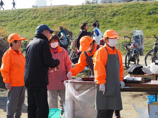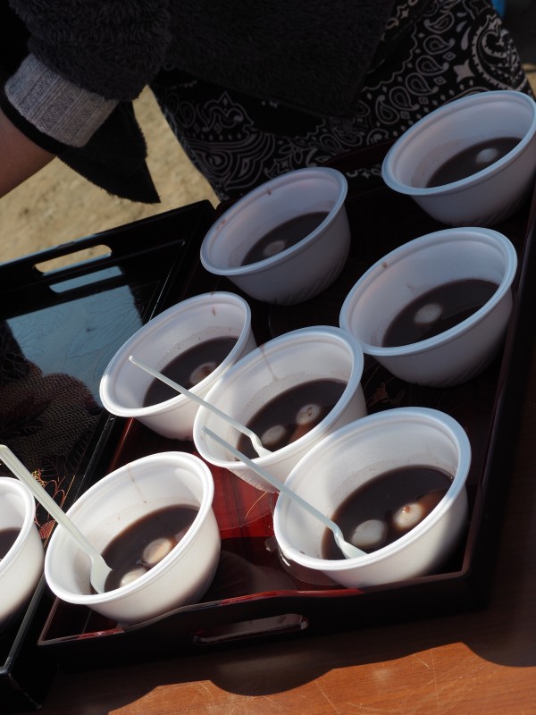 凧揚げの合間に、婦人会の皆さんが温かいお汁粉をふるまってくれました。