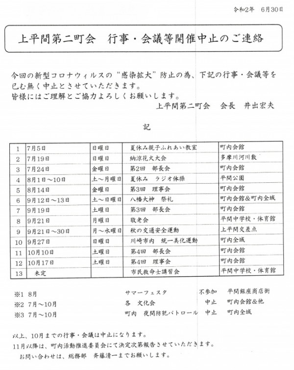 新型コロナウイルス ”感染拡大” 防止のため予定しておりました行事等を10月末まで中止とさせていただきます。
