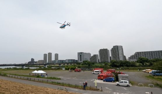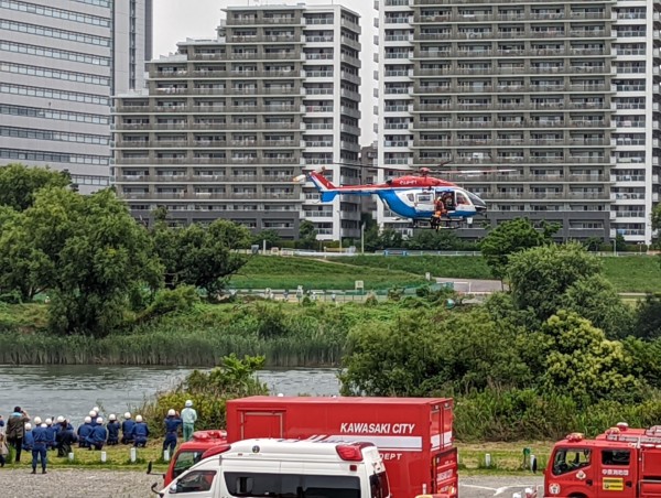訓練の最後には、救助ヘリコプターを使った水難事故の救助訓練が行われました。川崎市消防局は自前の救助ヘリコプターをもっており、有事の際には木場のヘリポートから出動するそうです。なお、木場からガス橋までは、10分程度で到着とのことでした。