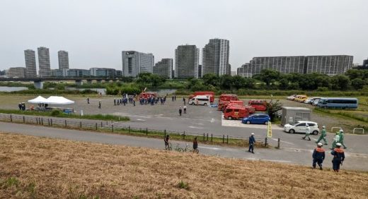 6月20日にガス橋近くの多摩川河川敷で、中原区消防署の水防訓練が実施されました。