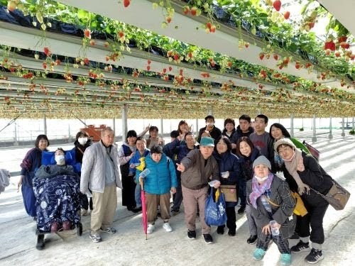 朝8時、今回の目的地である茨城県「グランベリー大地」を目指して川崎市役所本庁舎前を出発しました。「グランベリー大地」はいわゆる「空中いちご園」としてよくマスコミにも取り上げられています。昨年初めて行って、施設といちごの品質の良さに感動して、2年連続での企画となりました。今回もおなじみ農協観光の末長さんにプランを立ててもらい、当日の添乗もお願いしました。