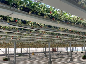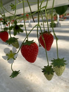 ハウス内は、いちご棚が天井から高い位置に下がっているリフト式で、全てのいちご棚が高い位置にある景色は、広くて壮観でした。しかも1棟貸し切りなので、ますますテンションが上がります。バスの中でいちご狩りについての注意点などが説明されたDVDを事前に観ていたのですが、改めてスタッフからの説明を受けていると、いちご棚がゆっくりと降りてきました。棚の高さは自由に変えられるので、手に取りやすい位置にいちごがくるようにセットしてくださいました。棚が地面にないので、平らでとても歩きやすかったです。