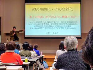 講師には、全国手をつなぐ育成会連合会常務理事兼事務局長の又村あおい氏をお迎えし、昨年に続き「親の高齢化・子の高齢化」より~本人の住まいをどのように確保するか~をテーマにご講演いただきました。